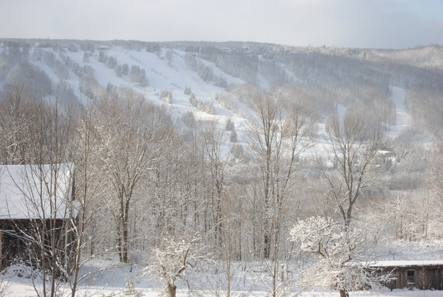 After yesterday's storm and this morning's streamers off Georgian Bay, winter has come to the valley. Trees are covered, the fields are white, and the ski clubs are open, snow making at full blast. There's still a haze of snow in the air, the hills of the valley looming faintly in the distance. And over it all loom the rocks of Old Baldy, as always.