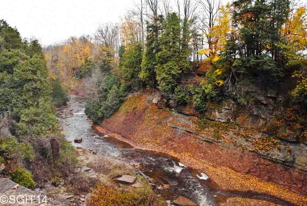 It's certainly a pretty waterfalls, but it's the geology that fascinates me, for this is a classic example of a waterfalls over the two lower layers of the Niagara Escarpment, the Manitoulin Limestone (the dark grey upper half) and the Queenston Shale (the two bluish and red lower layers). Several waterfalls in the valley fall over exactly the same formations, though none of them show it off as nicely as here.