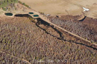 The stream only flows a few miles before reaching the sinkholes. Here it's flowing through a wetland on the left, and into a large beaver pond in the upper right background. You may be able to see the straight line of the beaver dam where the water ends toward the right hand side of the photo.