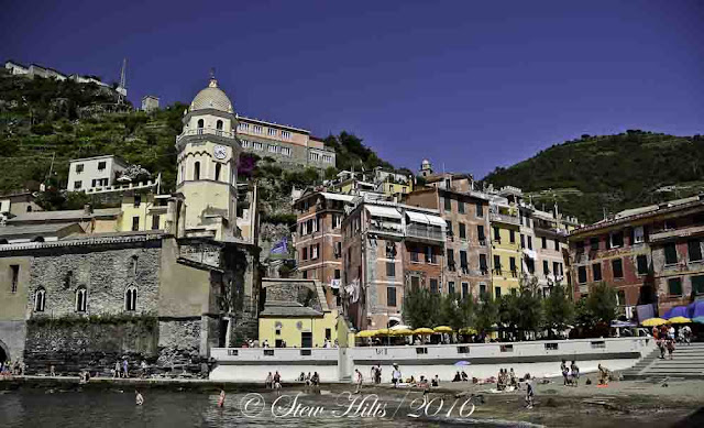 The last town we got to was Vernazza, with a nice but very small harbour and a tiny corner of beach. This town had suffered a mud slide that roared right down the main street (there is only one street), about ten feet deep in 2011. They've worked courageously since to re-open the town to tourists.