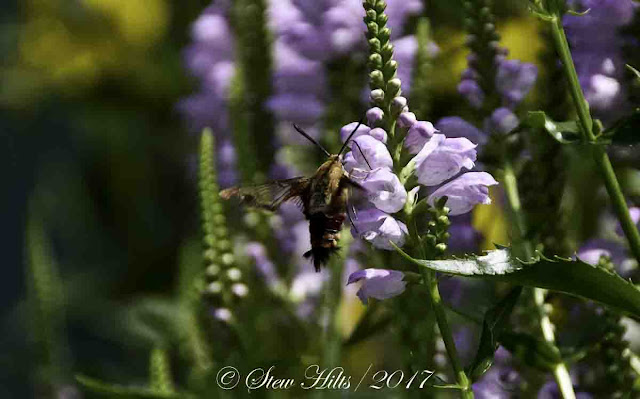 I was surprised to see this Hummingbird Clearwing, of the hawkmoth family on a tall Obedient Plant.