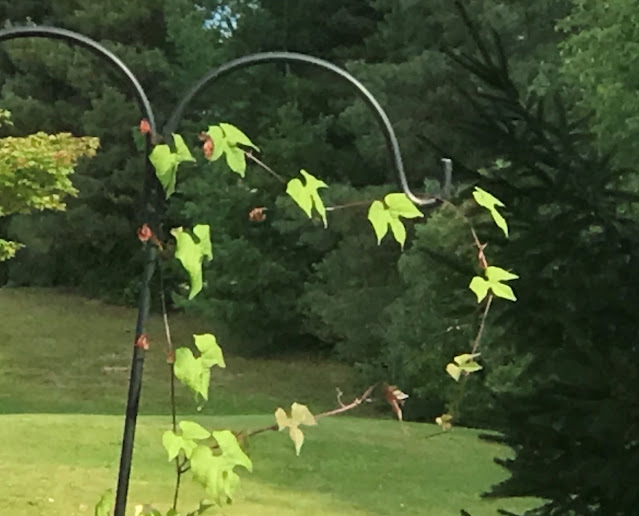 And does anyone know this vine? Mrs. F.G. says she knows, because she has it written down somewhere, but she can't find it. It just puzzles me because I've tried to identify it and so far I can't. The shape of the leaves is quite distinct, and as you can see it's finally starting to develop tiny flowers.