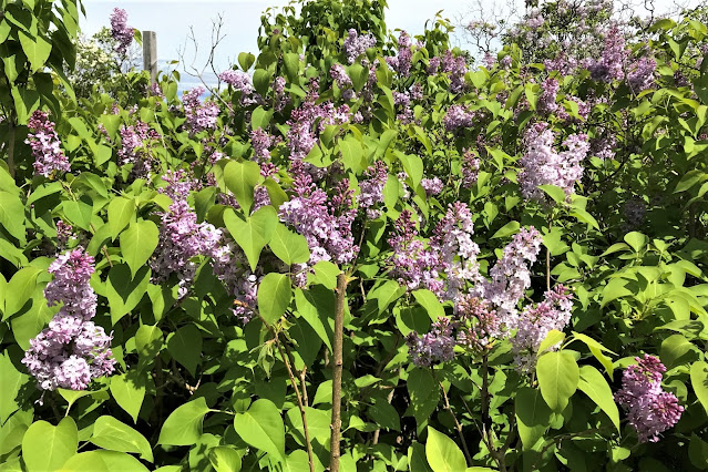 On Monday the sun was out and we decided to make our almost annual visit to the Lilac Trail running east of Craigleith. This is a stretch of the Georgian Trail, formerly the Northern Railway, which brought skiers to the foot of the Blue Mountain in years gone by. Today it's bordered by lovely Lilacs for 300 yards and many people come to view them every spring at this time.